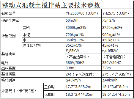我公(gong)司主要生產YHZS35/50/60/75型移動(dong)式混凝土攪拌站。移動式(shi)攪拌(ban)站(zhan)是將混凝土攪拌(ban)站(zhan)的物料(liao)儲料(liao)、稱量、輸(shu)送(song)、攪拌(ban)、卸(xie)料(liao)及全(quan)自動控制系(xi)統整(zheng)體集中與(yu)一個拖掛單元的混凝土生產設備;它與(yu)固(gu)定(ding)式(shi)全(quan)自動攪拌(ban)站(zhan)的所有(you)動作過程、操(cao)作方式(shi)、維修保養完全(quan)相同;同時具(ju)備移動靈活、拆裝迅捷(jie)簡便、存放管理簡單等有(you)的特點;是公鐵路、橋(qiao)梁、港口、水電(dian)等工(gong)程移動施工(gong)中的優配機型。